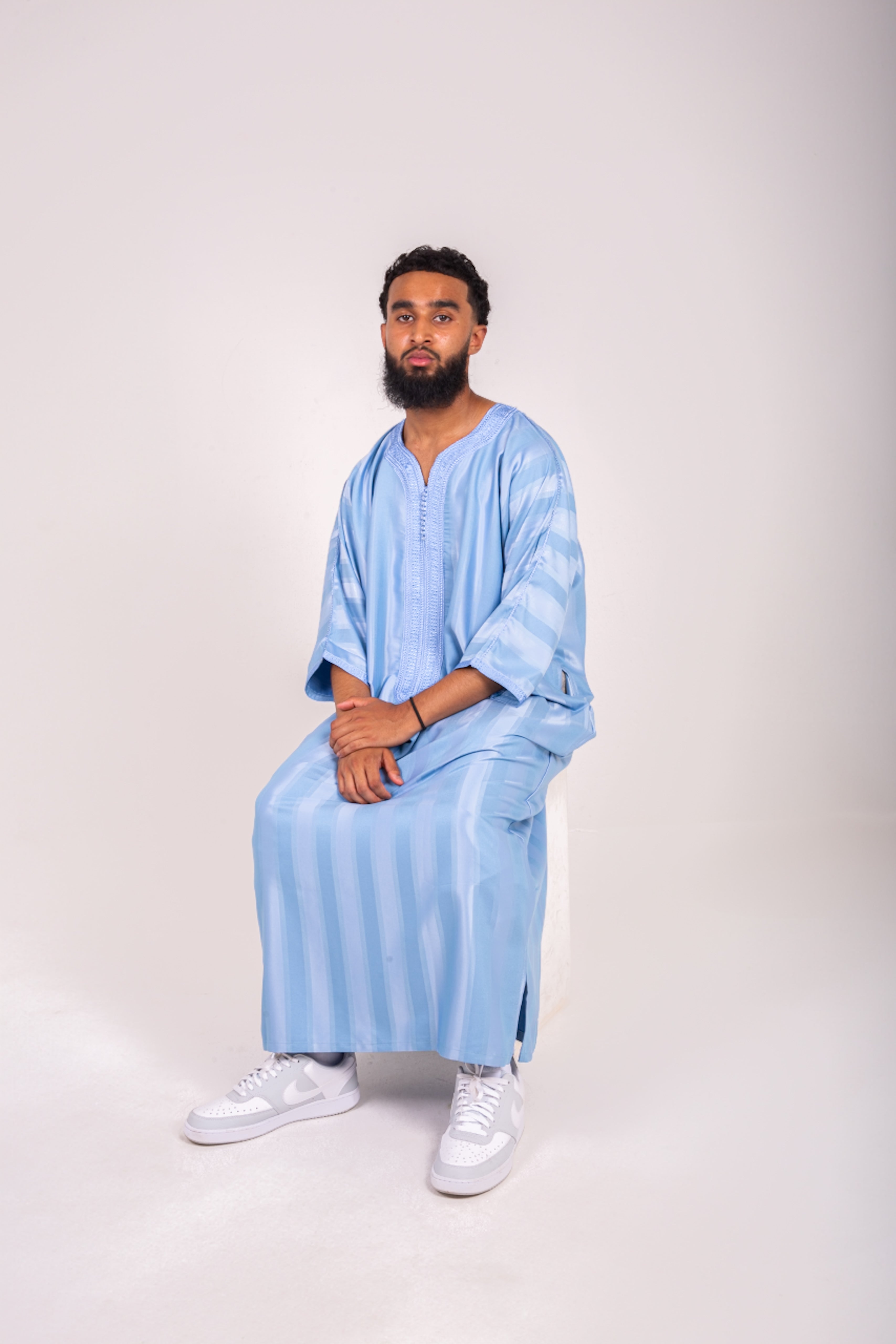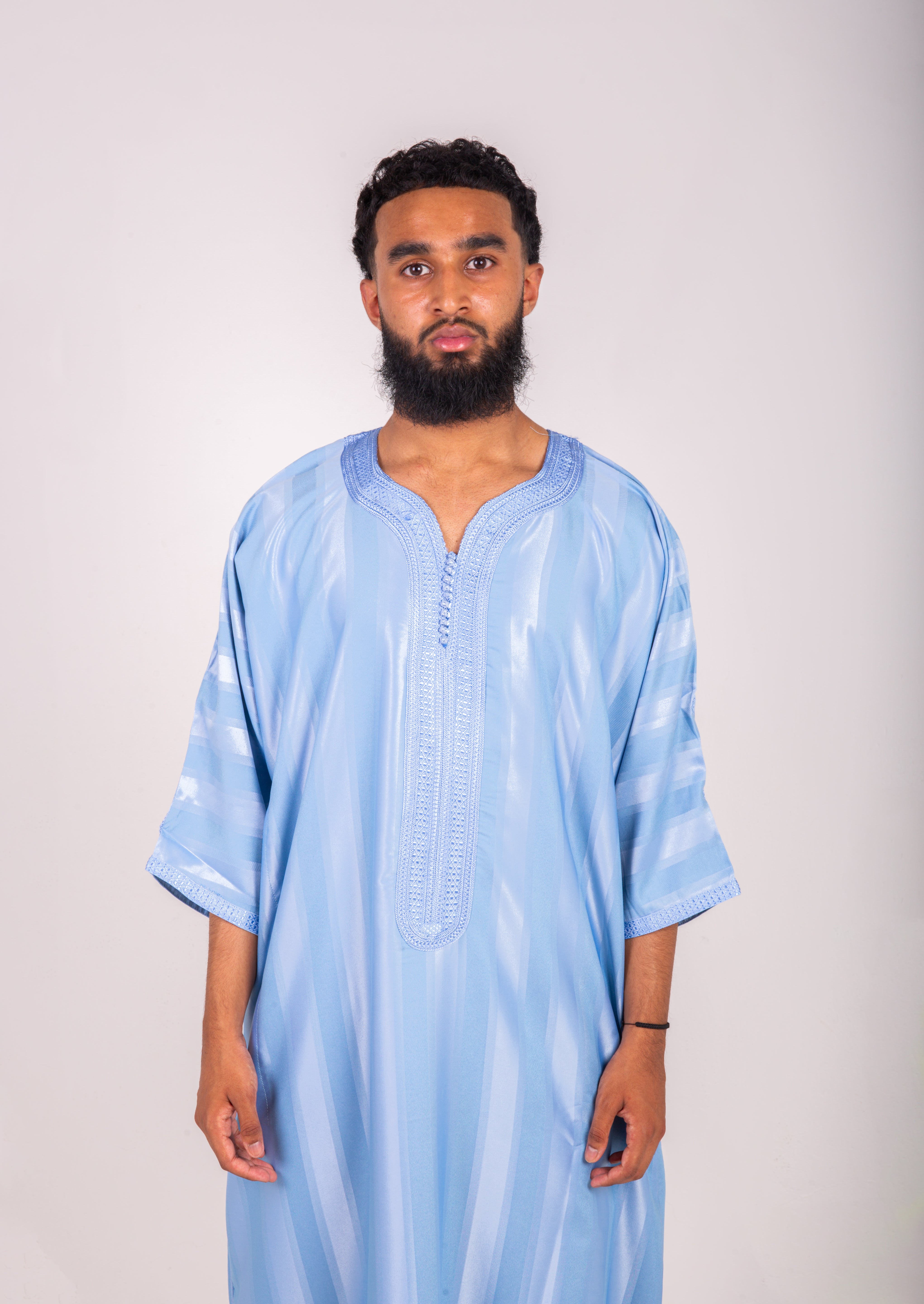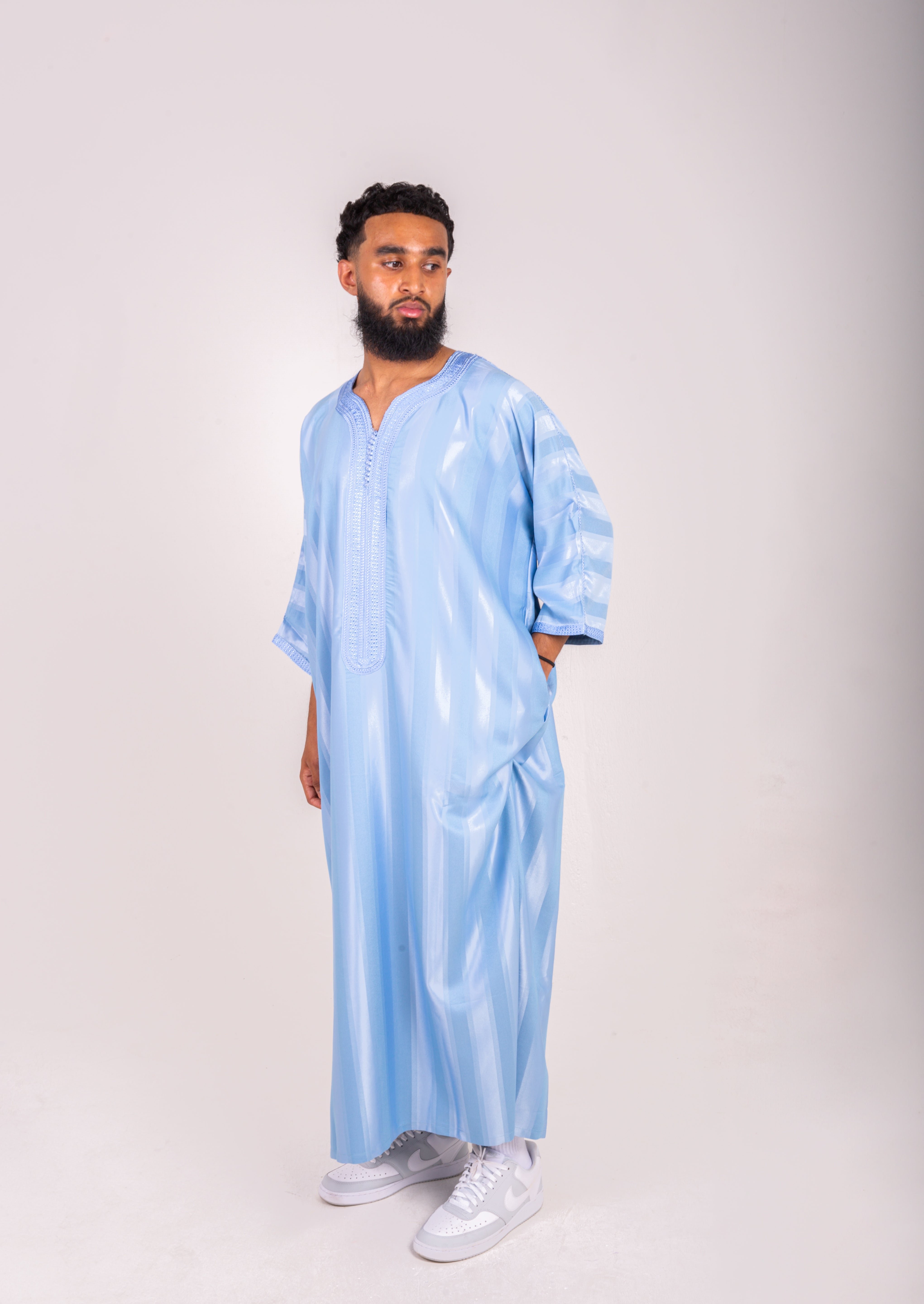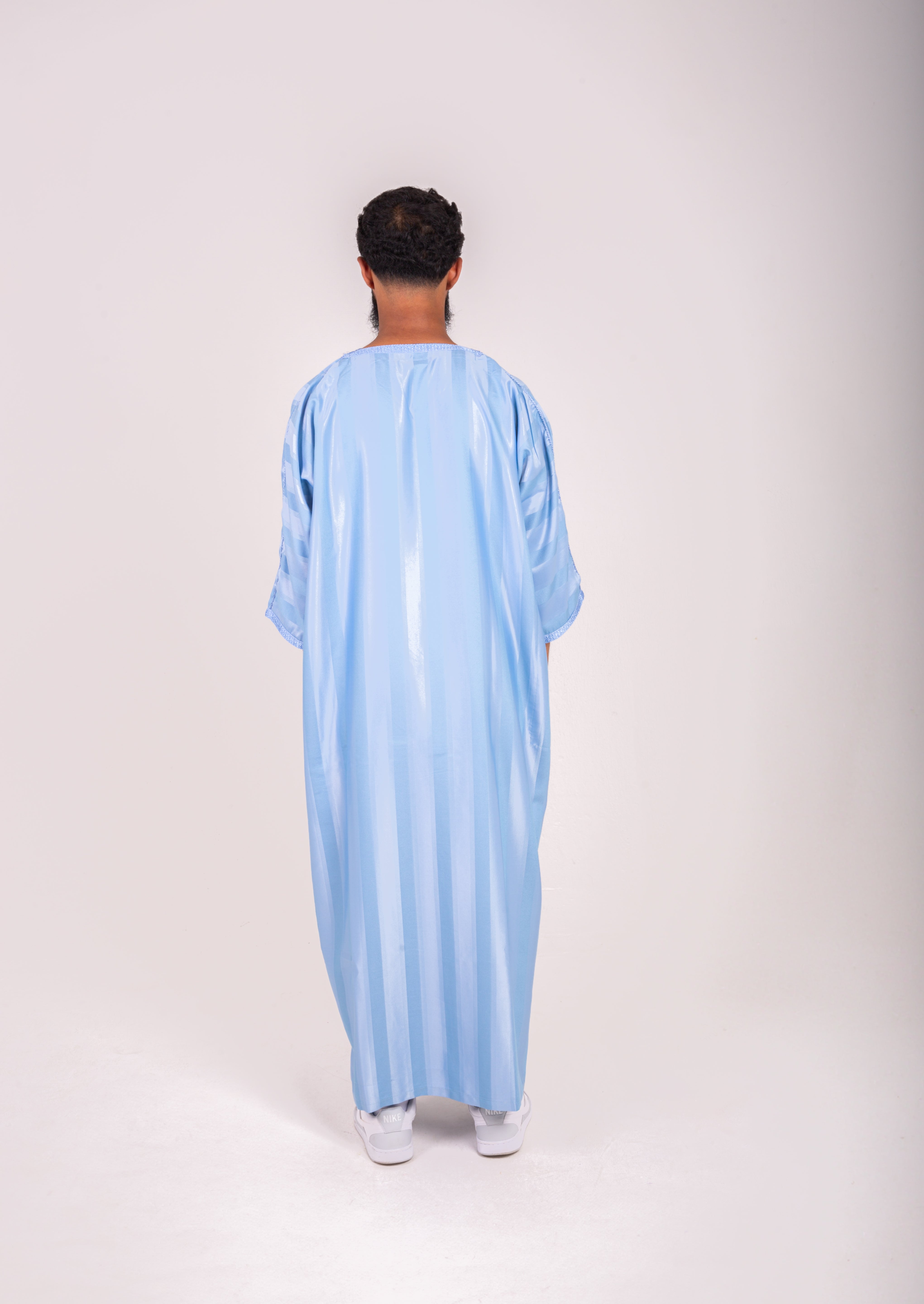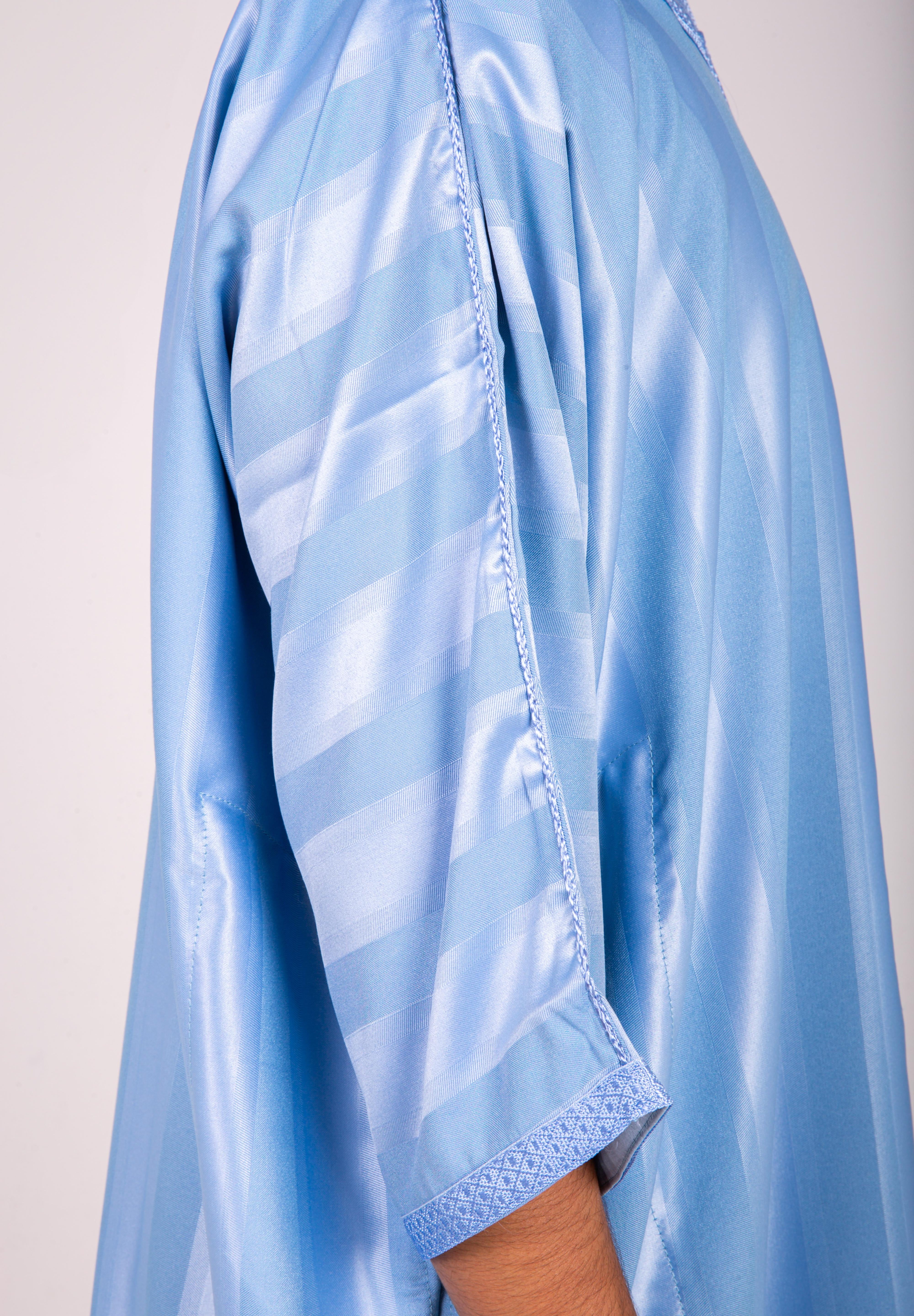 Light baby-blue silk-feel fabric shimmers with fine striped detailing, tailored in a comfortable, fluid shape. With one working pocket and a signature pocket-less side, it blends modern ease with Moroccan craft.