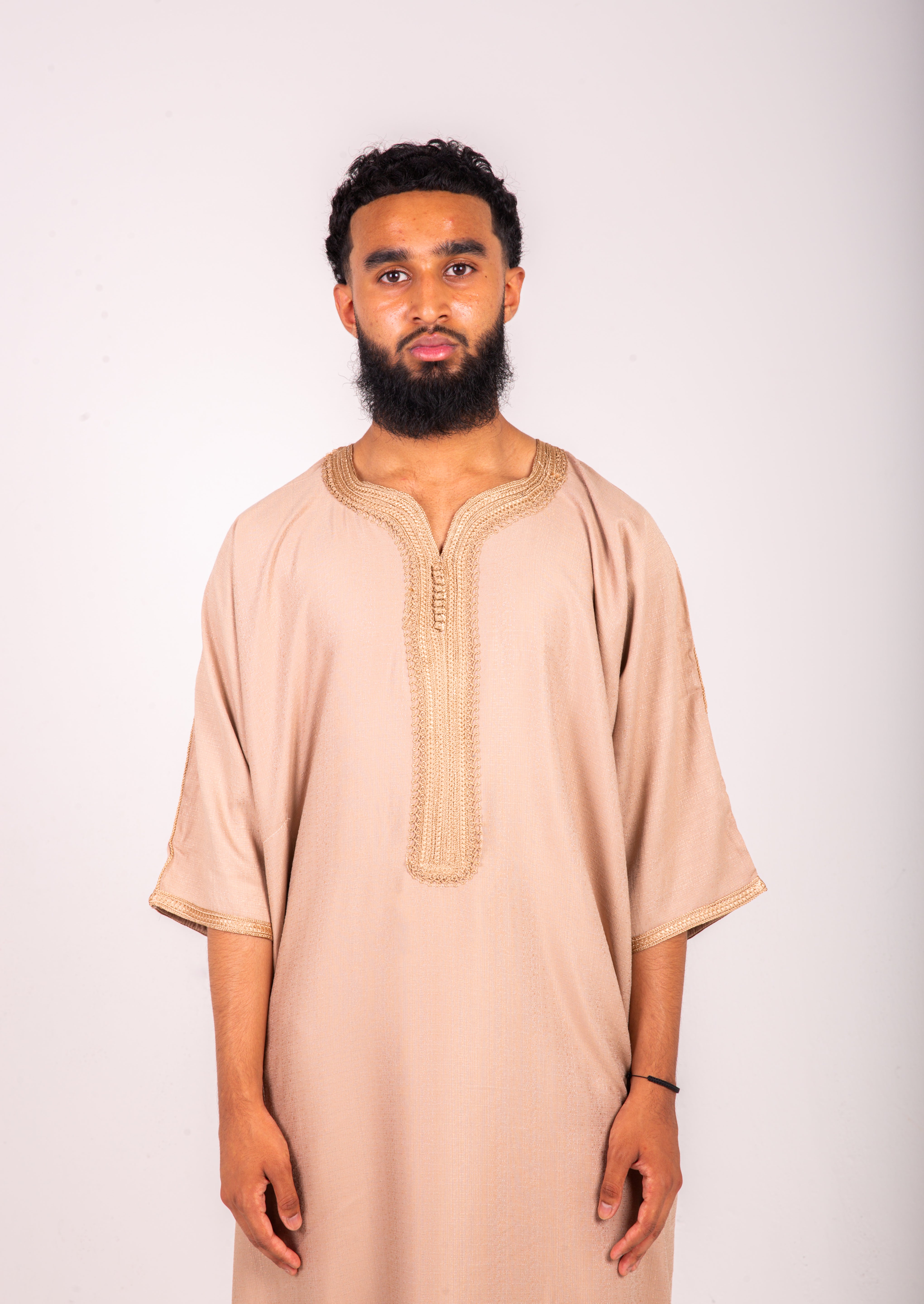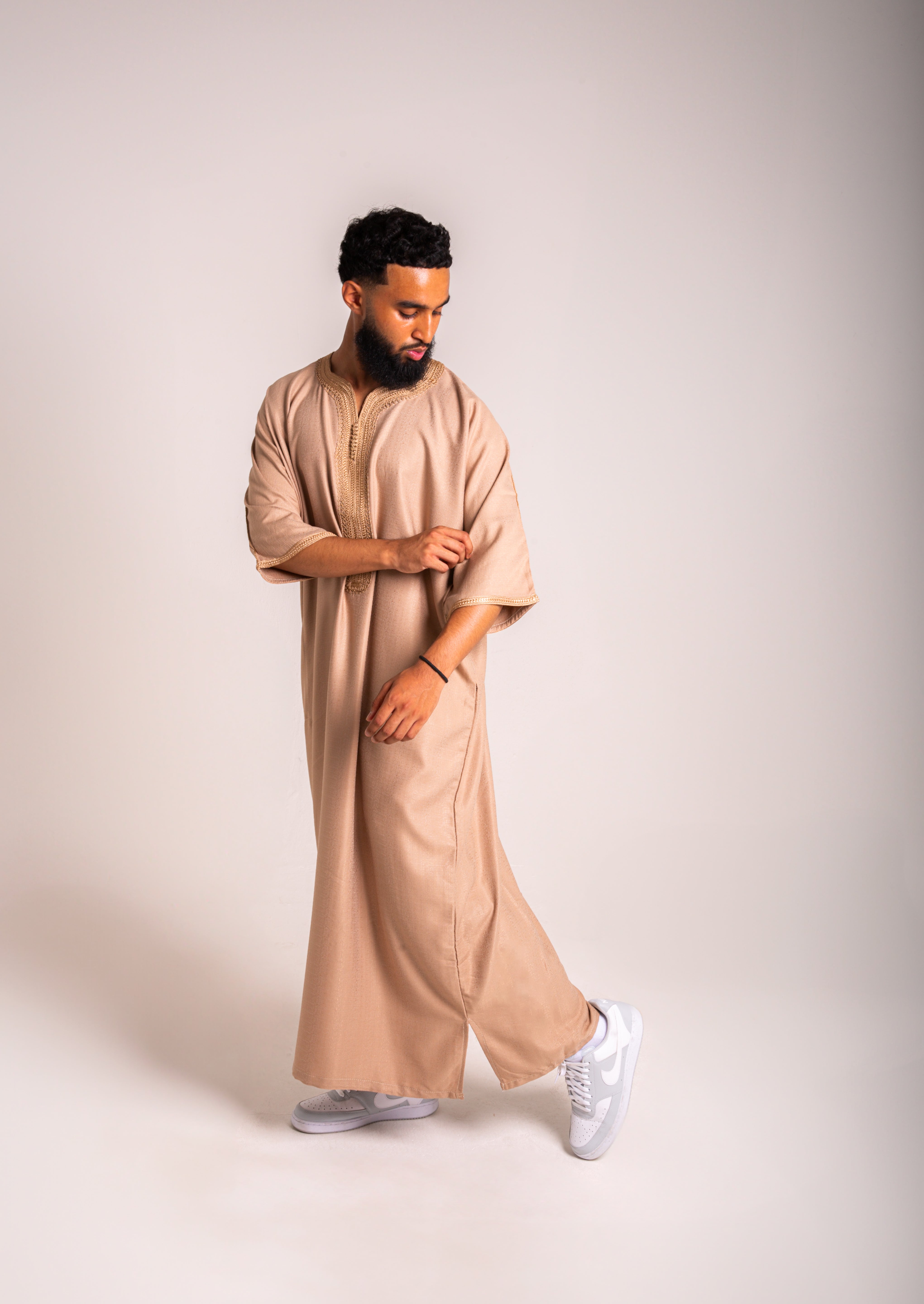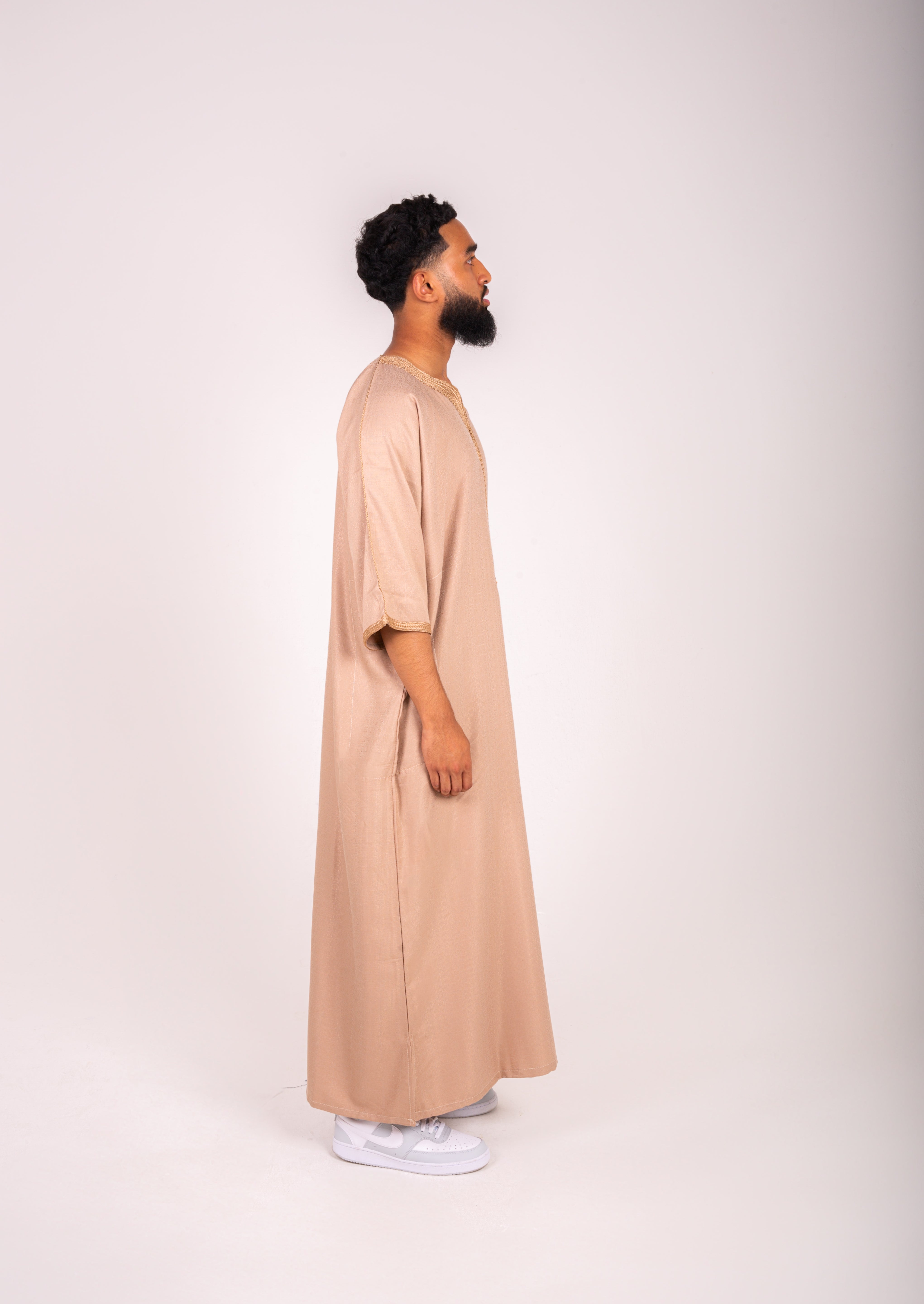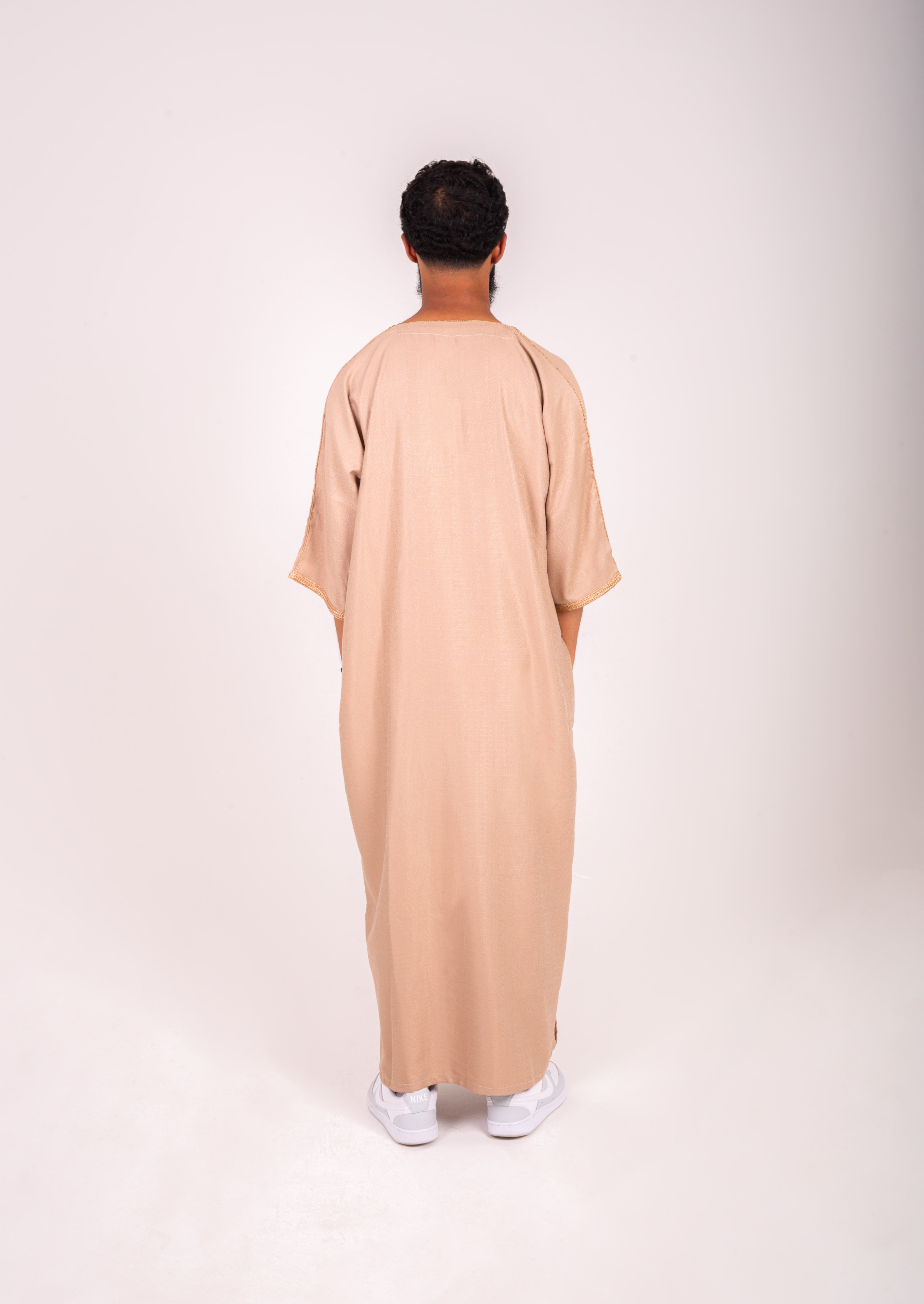 Classy Beige Linen Gandoura Straight Neck Pattern